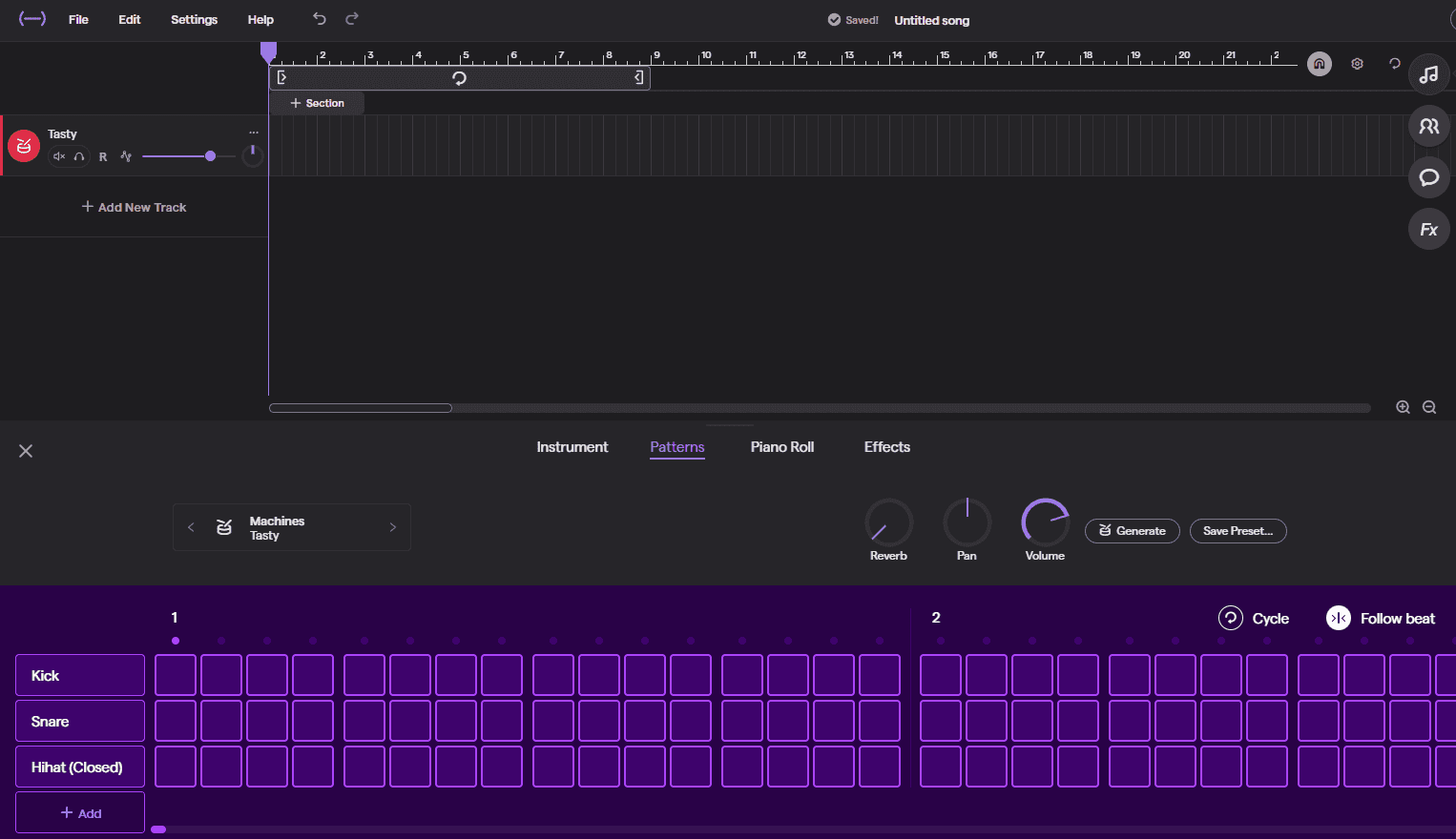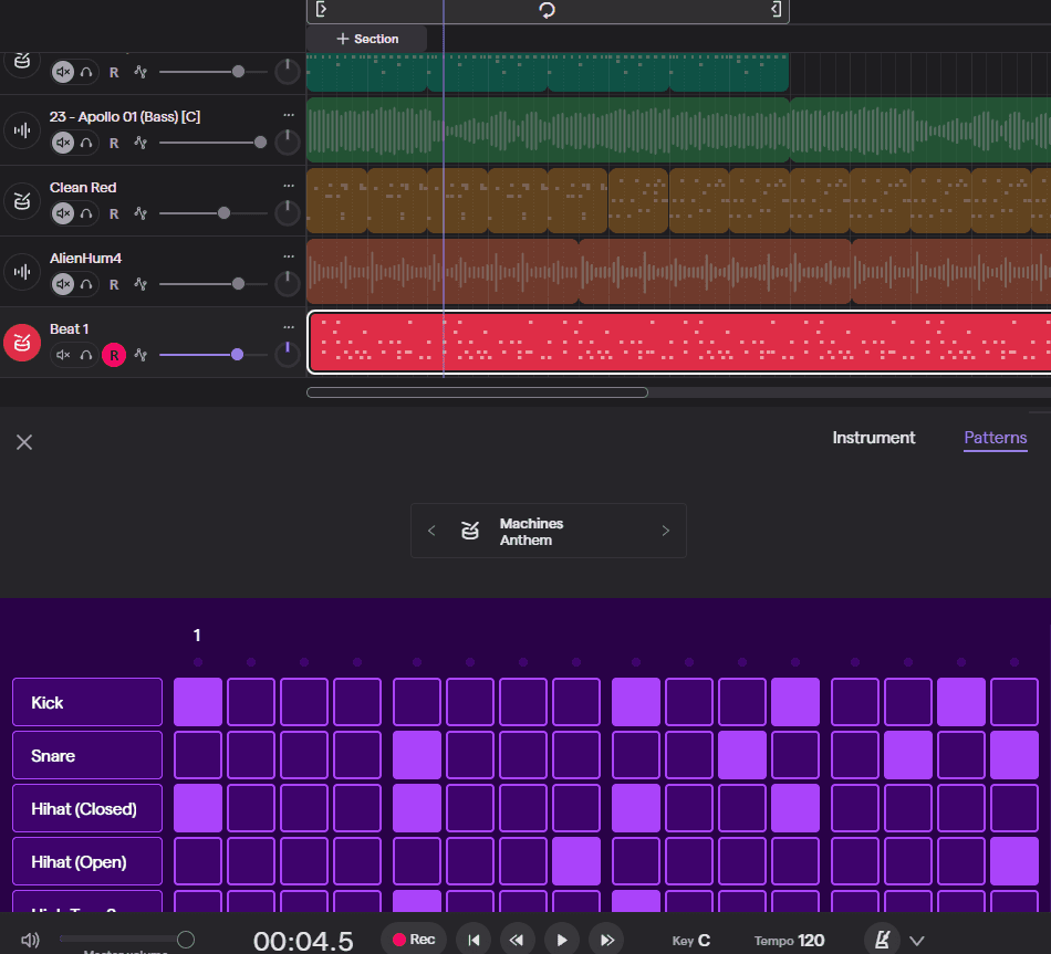 Once I got comfortable with the basics, I decided to make a beat from scratch. I opened the Pattern Beat Maker, which reminded me a bit of a pixel grid where each square represented a sound in time. The idea of visually mapping rhythm was interesting because it almost felt like animation timing—except now I was working with sound instead of visuals